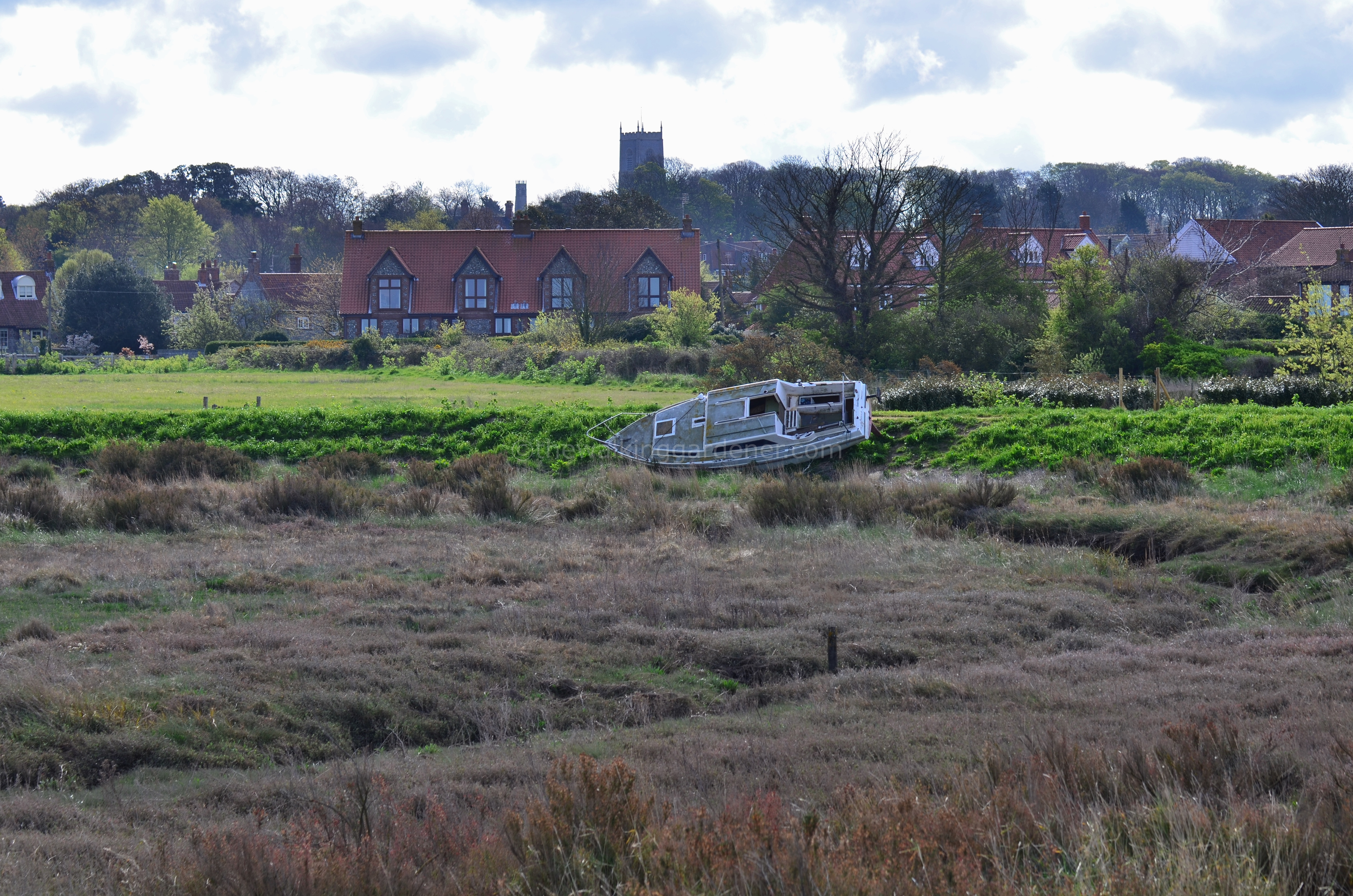 A couple of hours after leaving Blakeney, the village of Stiffkey beckoned to us for morning coffee. Studying the OS map, we headed inland along Bangay Green Way on a small diversion for cake; and found it in a wryly expensive cafe. Were I a wry local, I wouldn’t be a regular.